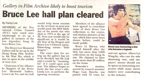 News report on the approval of setting up a "Bruce Lee Memorial Gallery" in Hong Kong
